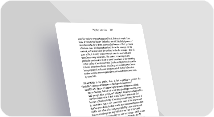 Playboy interview 227 uses his work to prepare the ground for it. But most people, from truck drivers to the literary Brahmins, are still blissfully ignorant of what the media do to them; unaware that because of their pervasive effects on man, it is the medium itself that is the message, not the content, and unaware that the medium is also the massage—that, all puns aside, it literally works over and saturates and molds and transforms every sense ratio. The content or message of any particular medium has about as much importance as the stenciling on the casing of an atomic bomb. But the ability to perceive media- induced extensions of man, once the province of the artist, is now being expanded as the new environment of electric information makes possible a new degree of perception and critical awareness by nonartists. PLAYBOY: Is the public, then, at last beginning to perceive the “invisible” contours of these new technological environments? McLUHAN: People are beginning to understand the nature of their new technology, but not yet nearly enough of them—and not nearly well enough. Most people, as I indicated, still cling to what I call the rearview-mirror view of their world. By this I mean to say that because of the invisibility of any environment during the period of its innovation, man is only consciously aware of the environment that has preceded it; in other words, an environment becomes fully visible only when it has been superseded by a new environment; thus we are always one step behind in our view of the world. Because we are benumbed by any new technology—which in turn creates a totally new environment—we tend to make the old environment more visible; we do so by turning it into an art form and by attaching ourselves to the objects and atmosphere that characterized it, just as we’ve done with jazz, and as we’re now doing with the garbage of the mechanical environment via pop art. The present is always invisible because it’s environmental and saturates the whole field of attention so overwhelmingly; thus everyone but the artist, the man of integral awareness, is alive in an earlier day. In the midst of the electronic age of software, of instant information movement, we still believe we’re living in the mechanical age of hardware. At the height of the mechanical age, man turned back to earlier centuries in search of “pastoral” values. The Renaissance and the Middle Ages were completely oriented toward Rome; Rome was oriented toward Greece, and the Greeks were oriented toward the pre-Homeric primitives. We reverse the old educational dictum of learning by proceeding from the familiar to the unfamiliar by going from the unfamiliar to the familiar, which is nothing more or less than the numbing mechanism that takes place whenever new media drastically extend our senses.