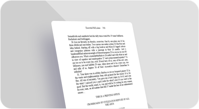 Essential McLuhan 318 Somedivide and sumthelot but the tally turns round the 19 same balifuson. Racketeers and bottloggers. 20 Axe on thwacks on thracks, axenwise. One by one place one 21 be three dittoh and one before. Two nursus one make a plaus 22 ible free and idim behind. Starting off with a big boaboa and three-23 legged calvers and ivargraine jadesses with a message in their 24 mouths. And a hundreadfilled unleavenweight of liberorumqueue 25 to con an we can till allhorrors eve. What a meanderthalltale to 26 unfurl and with what an end in view of squattor and anntisquattor 27 and postproneauntisquattor! To say too us to be every tim, nick 28 and larry of us, sons of the sod, sons, littlesons, yea and lealittle 29 sons, when usses not to be, every sue, siss and sally of us, dugters 30 of Nan! Accusative ahnsire! Damadam to infinities! 31. True there was in nillohs dieybos as yet no lumpend papeer 32 in the waste and mightmountain Penn still groaned for the micies 33 to let flee. All was of ancientry. You gave me a boot (signs on 34 it!) and I ate the wind. I quizzed you a quid (with for what?) and 35 you went to the quod. But the world, mind, is, was and will be 36 writing its own wrunes for ever, man, on all matters that fall 37 under the ban of our infrarational senses… THIS IS A PRINTING OFFICE CROSSROADS OF CIVILIZATION REFUGE OF ALL THE ARTS AGAINST THE RAVAGES OF TIME ARMOURY OF FEARLESS TRUTH AGAINST WHISPERING RUMOUR INCESSANT TRUMPET OF TRADE FROM THIS PLACE WORDS MAY FLY ABROAD NOT TO PERISH ON WAVES OF SOUND NOT TO VARY WITH THE WRITER’S HAND BUT FIXED IN TIME HAVING BEEN VERIFIED IN PROOF FRIEND YOU STAND ON SACRED GROUND THIS IS A PRINTING OFFICE