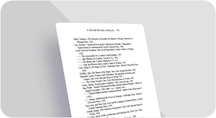 A Marshall McLuhan reading list 395 Kuhn, Thomas S. The Structure of Scientific Revolutions. Chicago: University of Chicago Press, 1962. Lee, Dorothy. “Lineal and Non-lineal Codifications of Reality.” Reprinted in Explorations in Communication. Boston: Beacon Press, 1960. Lewis, Percival Wyndham. The Art of Being Ruled. London: Chatto & Windus, 1926. ——. The Lion and the Fox. London: Grant Richards, 1927. ——. Men Without Art. London: Cassell & Co., 1934. ——. The Human Age. London: Methuen & Co., n.d. ——. Time and Western Man. London: Chatto & Windus, 1927. Lord, Albert B. The Singer of Tales. Cambridge, Mass.: Harvard University Press, 1960. McHale, John. The Future of the Future. New York: George Braziller, 1969. Mumford, Lewis. Technics and Civilization: The Interplay of Artefact and Culture. New York: Harcourt Brace & World, 1934. ——. The Urban Prospect. New York: Harcourt Brace & World, 1969. Olson, Charles. Proprioception. Berkeley, Calif.: Four Seasons, 1965. Ong, Walter. “Ramist Classroom Procedure and the Nature of Reality.” Studies in English Literature, 1500–1900 1, no. 1 (winter 1961). ——. “Ramist Method and the Commercial Mind.” Studies in the Renaissance 8 (1961). ——. Ramus: Method and the Decay of Dialogue. Cambridge, Mass.: Harvard University Press, 1958. Opie, Iona, and Peter Opie. Lore and the Language of Schoolchildren. Oxford: Oxford University Press, 1959. Orwell, George. 1984. Edited by Irving Howe. New York: Harcourt Brace & World, 1962. Panofsky, Irwin. Gothic Architecture and Scholasticism. 2d ed. New York: Meridian Books, 1957. Plato. Dialogues. Translated by B.Jowett. New York: n.p., 1895. Polanyi, Karl. The Great Transformation. New York: Farrar Strauss, 1944; Boston: Beacon Press paperback, 1957. Polanyi, Karl, Conrad M.Arenberg, and Harry W.Pearson, eds. Trade and Market in Early Empires. Glencoe, Ill.: The Free Press, 1957. Pope, Alexander. The Dunciad. Edited by James Sutherland. 2d ed. London: Methuen & Co., 1953. Popper, Karl R. The Open Society and Its Enemies. Princeton: Princeton University Press, 1950. Pound, Ezra. The Spirit of Romance. Norfolk, Conn.: New Directions Press, 1929. Riesman, David J. with Reuel Denney and Nathan Glazer. The Lonely Crowd. New Haven: Yale University Press, 1950. Ruskin, John. Modern Painters. New York: Dutton, Everyman ed., n.d. Russell, Bertrand. ABC of Relativity. 1925. Rev. ed. London: Allen & Unwin, 1958; New York: Mentor paperback, 1959. ——. History of Western Philosophy. London: Allen & Unwin, 1946. Samuelson, Paul A. Economics. New York: McGraw-Hill, 1961. Selye, Hans. From Dream to Discovery: On Being a Scientist. New York: McGraw-Hill, 1964. ——. The Stress of Life. New York: McGraw-Hill, 1956. Spengler, Oswald. The Decline of the West. London: Allen & Unwin, 1918. Tawney, R.H. Religion and the Rise of Capitalism. Holland Memorial Lectures, 1922. New York: Pelican Books, 1947.