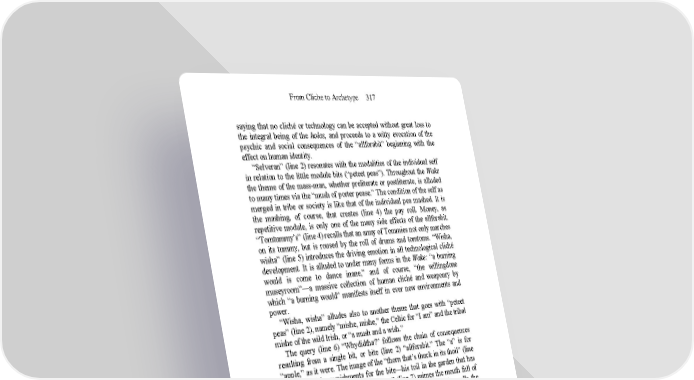 From Cliche to Archetype 317 saying that no cliché or technology can be accepted without great loss to the integral being of the holos, and proceeds to a witty evocation of the psychic and social consequences of the “allforabit” beginning with the effect on human identity. “Selveran” (line 2) resonates with the modalities of the individual self in relation to the little module bits (“peteet peas”). Throughout the Wake the theme of the mass-man, whether preliterate or postliterate, is alluded to many times via the “mush of porter pease.” The condition of the self as merged in tribe or society is like that of the individual pea mashed. It is the mashing, of course, that creates (line 4) the pay roll. Money, as repetitive module, is only one of the many side effects of the allforabit. “Tomtummy’s” (line 4) recalls that an army of Tommies not only marches on its tummy, but is roused by the roll of drums and tomtoms. “Wisha, wisha” (line 5) introduces the driving emotion in all technological cliché development. It is alluded to under many forms in the Wake: “a burning would is come to dance inane,” and of course, “the willingdone museyroom”—a massive collection of human cliché and weaponry by which “a burning would” manifests itself in ever new environments and power. “Wisha, wisha” alludes also to another theme that goes with “peteet peas” (line 2), namely “mishe, mishe,” the Celtic for “I am” and the tribal mishe of the wild Irish, or “a mush and a wish.” The query (line 6) “Whydidtha?” follows the chain of consequences resulting from a single bit, or bite (line 2) “allforabit.” The “a” is for “apple,” as it were. The image of the “thorn that’s thuck in its thoil” (line 6) is one of the punishments for the bite—his toil in the garden that has now become a mess. The word “mness” (line 7) mimes the mouth full of apple, as it were. “A middenhide hoard of objects” (line 8) recalls the impulse of fallen man to cover himself (hides, skins). Instead of plucking the fruit as it grows, he now specializes in 1 When a part so ptee does duty for the holos we soon grow to use of an 2 allforabit. Here (please to stoop) are selveran cued peteet peas of 3 quite a pecuniar interest inaslittle as they are the pellets that make 4 the tomtummy’s pay roll. Right rank ragnar rocks and with these 5 rox orangotangos rangled rough and rightgorong. Wisha, wisha, 6 whydidtha? Thik is for thorn that’s thuck in its thoil like thum 7 fool’s thraitor thrust for vengeance. What a mnice old mness it 8 all mnakes! A middenhide hoard of objects! Olives, beets, kim 9 mells, dollies, alfrids, beatties, cormacks and daltons. Owlets’ eegs 10 (O stoop to please!) are here, creakish from age and all now 11 quite epsilene, and oldwolldy wobblewers, haudworth a wipe o 12 grass. Sss! See the snake wurrums everyside! Our durlbin is 13 sworming in sneaks. They came to our island from triangular 14 Toucheaterre beyond the wet prairie rared up in the midst of the 15 cargon of prohibitive pomefructs but along landed Paddy Wip 16 pingham and the his garbagecans cotched the creeps of them 17 pricker than our whosethere outofman could quick up her whats 18 thats.