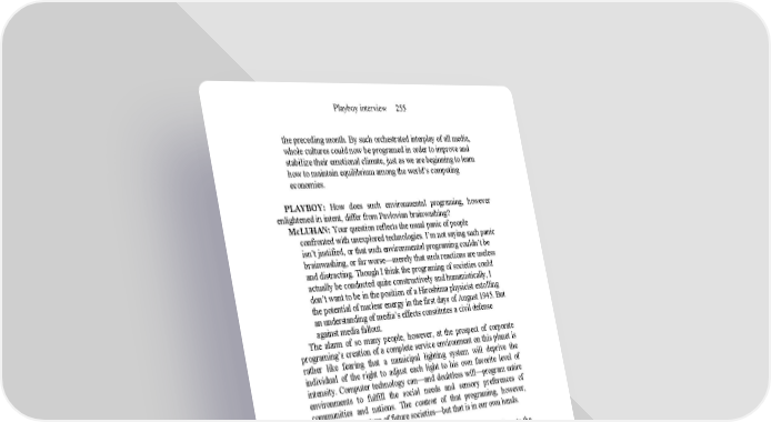 Playboy interview 255 the preceding month. By such orchestrated interplay of all media, whole cultures could now be programed in order to improve and stabilize their emotional climate, just as we are beginning to learn how to maintain equilibrium among the world’s competing economies. PLAYBOY: How does such environmental programing, however enlightened in intent, differ from Pavlovian brainwashing? McLUHAN: Your question reflects the usual panic of people confronted with unexplored technologies. I’m not saying such panic isn’t justified, or that such environmental programing couldn’t be brainwashing, or far worse—merely that such reactions are useless and distracting. Though I think the programing of societies could actually be conducted quite constructively and humanistically, I don’t want to be in the position of a Hiroshima physicist extolling the potential of nuclear energy in the first days of August 1945. But an understanding of media’s effects constitutes a civil defense against media fallout. The alarm of so many people, however, at the prospect of corporate programing’s creation of a complete service environment on this planet is rather like fearing that a municipal lighting system will deprive the individual of the right to adjust each light to his own favorite level of intensity. Computer technology can—and doubtless will—program entire environments to fulfill the social needs and sensory preferences of communities and nations. The content of that programing, however, depends on the nature of future societies—but that is in our own hands. PLAYBOY: Is it really in our hands—or, by seeming to advocate the use of computers to manipulate the future of entire cultures, aren’t you actually encouraging man to abdicate control over his destiny? McLUHAN: First of all—and I’m sorry to have to repeat this disclaimer—I’m not advocating anything; I’m merely probing and predicting trends. Even if I opposed them or thought them disastrous, I couldn’t stop them, so why waste my time lamenting? As Carlyle said of author Margaret Fuller after she remarked, “I accept the Universe”: “She’d better.” I see no possibility of a world- wide Luddite rebellion that will smash all machinery to bits, so we might as well sit back and see what is happening and what will happen to us in a cybernetic world. Resenting a new technology will not halt its progress. The point to remember here is that whenever we use or perceive any technological extension of ourselves, we necessarily embrace it. Whenever we watch a TV screen or read a book, we are absorbing these extensions of ourselves into our individual system and experiencing an automatic “closure” or displacement of perception; we can’t escape this perpetual embrace of our daily technology