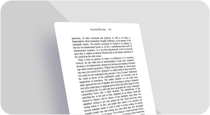 Essential McLuhan 134 operations, of states emotional and political, as well as of tasks—a fragmentation which terminated, thought Durkheim, in the anomie of the nineteenth century. The paradox presented by Professor von Bekesy is that the two-dimensional mosaic is, in fact, a multidimensional world of interstructural resonance. It is the three-dimensional world of pictorial space that is, indeed, an abstract illusion built on the intense separation of the visual from the other senses. There is here no question of values or preferences. It is necessary, however, for any other kind of understanding to know why “primitive” drawing is two-dimensional, whereas the drawing and painting of literate man tends towards perspective. Without this knowledge we cannot grasp why men ever ceased to be “primitive” or audile-tactile in their sense bias. Nor could we ever understand why men have “since Cézanne” abandoned the visual in favour of the audiletactile modes of awareness and of organization of experience. This matter clarified, we can much more easily approach the role of alphabet and of printing in giving a dominant role to the visual sense in language and art and in the entire range of social and of political life. For until men have up-graded the visual component communities know only a tribal structure. The detribalizing of the individual has, in the past at least, depended on an intense visual life fostered by literacy, and by literacy of the alphabetic kind alone. For alphabetic writing is not only unique but late. There had been much writing before it. In fact, any people that ceases to be nomadic and pursues sedentary modes of work is ready to invent writing. No merely nomadic people ever had writing any more than they ever developed architecture or “enclosed space.” For writing is a visual enclosure of non- visual spaces and senses. It is, therefore, an abstraction of the visual from the ordinary sense interplay. And whereas speech is an outering (utterance) of all our senses at once, writing abstracts from speech. At the present time it is easier to grasp this specific technology of writing. The new institutes for teaching speeded-up reading habits work on the separation of eye-movements from inner verbalization. It will be indicated later that all reading in the ancient and medieval worlds was reading aloud. With print the eye speeded up and the voice quieted down. But inner verbalizing was taken for granted as inseparable from the horizontal following of the words on the page. Today we know that the divorce of reading and verbalizing can be made by vertical reading. This, of course, pushes the alphabetic technology of the separation of the senses to an extreme of inanity, but it is relevant to an understanding of how writing of any sort gets started. In a paper entitled “A History of the Theory of Information,” read to the Royal Society in 1951, E.Colin Cherry of the University of London, observed that “Early invention was greatly hampered by an inability to dissociate mechanical structure from animal form: The invention of the wheel was one outstanding early effort of such dissociation. The great spurt in invention which began in the sixteenth century rested on the
