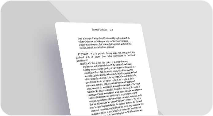 Essential McLuhan 230 lived in a magical integral world patterned by myth and ritual, its values divine and unchallenged, whereas literate or visual man creates an environment that is strongly fragmented, individualistic, explicit, logical, specialized and detached. PLAYBOY: Was it phonetic literacy alone that precipitated this profound shift of values from tribal involvement to “civilized” detachment? McLUHAN: Yes, it was. Any culture is an order of sensory preferences, and in the tribal world, the senses of touch, taste, hearing and smell were developed, for very practical reasons, to a much higher level than the strictly visual. Into this world, the phonetic alphabet fell like a bombshell, installing sight at the head of the hierarchy of senses. Literacy propelled man from the tribe, gave him an eye for an ear and replaced his integral in-depth communal interplay with visual linear values and fragmented consciousness. As an intensification and amplification of the visual function, the phonetic alphabet diminished the role of the senses of hearing and touch and taste and smell, permeating the discontinuous culture of tribal man and translating its organic harmony and complex synaesthesia into the uniform, connected and visual mode that we still consider the norm of “rational” existence. The whole man became fragmented man; the alphabet shattered the charmed circle and resonating magic of the tribal world, exploding man into an agglomeration of specialized and psychically impoverished “individuals,” or units, functioning in a world of linear time and Euclidean space. PLAYBOY: But literate societies existed in the ancient world long before the phonetic alphabet. Why weren’t they detribalized? McLUHAN: The phonetic alphabet did not change or extend man so drastically just because it enabled him to read; as you point out, tribal culture had already coexisted with other written languages for thousands of years. But the phonetic alphabet was radically different from the older and richer hieroglyphic or ideogrammic cultures. The writings of Egyptian, Babylonian, Mayan and Chinese cultures were an extension of the senses in that they gave pictorial expression to reality, and they demanded many signs to cover the wide range of data in their societies—unlike phonetic writing, which uses semantically meaningless letters to correspond to semantically meaningless sounds and is able, with only a handful of letters, to encompass all meanings and all languages. This achievement demanded the separation of both sights and sounds from their semantic and dramatic meanings in order to render visible the actual sound of speech, thus placing a barrier between men and objects and creating a dualism between sight and sound. It divorced the visual