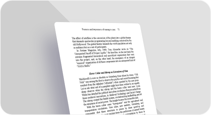 Postures and impostures of managers past 73 The effect of satellites is the conversion of the planet into a global theater that demands spectacular programming beyond anything conceived by the old Hollywood. The global theater demands the world population not only as audience but as a cast of participants. In Fortune Magazine, July, 1969, Tom Alexander wrote on “The Unexpected Payoff of Project Apollo.” He describes, on the one hand, the extreme fragmented hierarchical and specialized organization that went into the project, and, on the other hand, the emergency of an integral “musical” organization of all these components into an unexpected kind of “NASA Mafia.” Horse Collar and Stirrup as Extensions of Man Machiavelli is now as obsolete as Gutenberg from whom he stems. “Old Nick” was among the first to observe the psychic and social fracturing that resulted from the alphabet (“alforabit”) when speeded by the new press. Let us ask what sort of a pamphlet might have been written by an equally sharp observer when the stirrup and the horse collar were new. Lynn White has detailed the political and urban revolutions that proceeded from those medieval innovations, in Medieval Technology and Social Change. The stirrup created the feudal system, revolutionizing landholding and all the structures of social power. The knight became the invincible tank. With the horse collar came “horsepower” and the agricultural and transportation revolutions. New cities, new markets, Gutenberg, and gunpowder shot these structures to pieces by sheer speed-up and specialism. From the most ancient times the perfections of natural beauty had been the supreme focus of intellectual contemplation by those in power. The break from regarding nature as beauty to exploiting nature as a source of power and wealth came suddenly. It gathered momentum in the sixteenth century with the press and was dominant until the turn of the nineteenth century. Humpty Dumpty: China Egg on the Magazine Wall …a break-through after a long accumulation of tension, as a swollen river breaks through its dikes, or in the manner of a cloudburst… Applied to human conditions, it refers to the time when inferior people gradually begin to disappear. Their influence is on the wane; as a result of resolute action, a change in conditions occurs, a break-through… (I Ching)