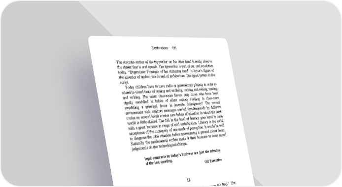 Explorations 191 The staccato stutter of the typewriter on the other hand is really close to the stutter that is oral speech. The typewriter is part of our oral revolution today. “Bygmeister Finnegan of the stuttering hand” is Joyce’s figure of the inventor of spoken words and of architecture. The typist yatters to the script. Today children have to have radio or gramophone playing in order to attend to visual tasks of reeling and writhing, rocking and rolling, reading and writing. The silent class-room favors only those who have been rigidly swaddled in habits of silent solitary reading. Is class-room swaddling a principal factor in juvenile delinquency? The normal environment with auditory messages carried simultaneously by different media on several levels creates new habits of attention in which the adult world is little-skilled. The fall in the level of literacy goes hand in hand with a great increase in range of oral verbalization. Literacy is the social acceptance of the monopoly of one mode of perception. It would be well to diagnose the total situation before pronouncing a general moral doom. Naturally the professional scribes make it their business to issue moral judgements on this technological change. legal contracts in today’s business are just the minutes of the last meeting. Oil Executive 12 In English libel law, “the greater the truth the greater the libel.” The English conception of libel is aristocratic and oral, the American is written. Oral codes have no loop-holes for legal eagles. In oral codes the sanctions are total: ostracism-the duel. In written, sanctions are lineal and metrical—the fine, the damages. The Merchant of Venice is the dramatization of a clash between oral and written codes.