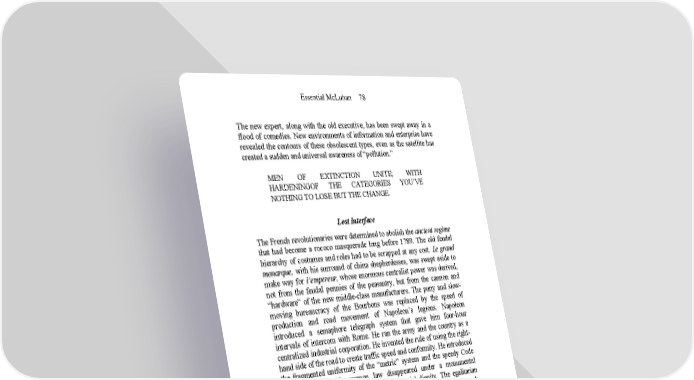 Essential McLuhan 78 The new expert, along with the old executive, has been swept away in a flood of comedies. New environments of information and enterprise have revealed the contours of these obsolescent types, even as the satellite has created a sudden and universal awareness of “pollution.” MEN OF EXTINCTION UNITE; WITH HARDENINGOF THE CATEGORIES YOU’VE NOTHING TO LOSE BUT THE CHANGE. Lost Interface The French revolutionaries were determined to abolish the ancient regime that had become a rococo masquerade long before 1789. The old feudal hierarchy of costumes and roles had to be scrapped at any cost. Le grand monarque, with his surround of china shepherdesses, was swept aside to make way for l’empereur, whose enormous centralist power was derived, not from the feudal pennies of the peasantry, but from the cannon and “hardware” of the new middle-class manufacturers. The puny and slow- moving bureaucracy of the Bourbons was replaced by the speed of production and road movement of Napoleon’s legions. Napoleon introduced a semaphore telegraph system that gave him four-hour intervals of intercom with Rome. He ran the army and the country as a centralized industrial corporation. He invented the rule of using the right- hand side of the road to create traffic speed and conformity. He introduced the fragmented uniformity of the “metric” system and the speedy Code Napoleon. The old common law disappeared under a monumental catafalque of classical solemnity and senatorial dignity. The egalitarian dreams of the Jacobins were gaily sacrificed, to la gloire et l’honneur de la patrie. The idealists had fought for liberty and equality, and they got a military state with careers open to talents. Napoleon anticipated the later organization chart with “staff and line,” proclaiming the right of every private to envisage a marshal’s baton in his old kit bag. These were the visible developments that reversed the dreams of the avantgarde. A far more insidious force was inherent in the entire speed-up of the new industrial “hardware” complex. 3. “Ground” Remakes “Figure” Hidden Environments Reshape Their Makers In Europe and in England alike the extreme specialism of the industrial revolution created a massive retrieval of medieval sensibility in the arts and crafts, and in religion. This was the new hidden ground that entered into abrasive interface with the pronounced figure of the dominant new industrialisms. This hidden action in the later nineteenth century has its