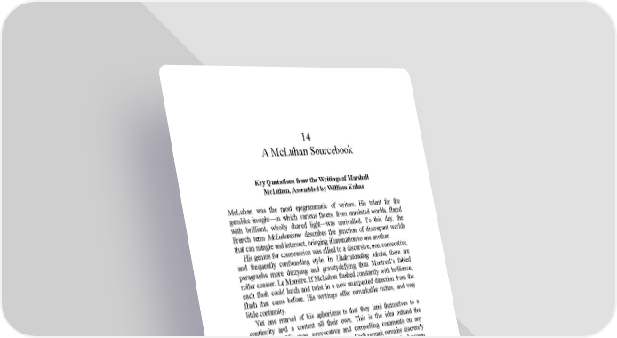 14 A McLuhan Sourcebook Key Quotations from the Writings of Marshall McLuhan, Assembled by William Kuhns McLuhan was the most epigrammatic of writers. His talent for the gemlike insight—in which various facets, from unrelated worlds, flared with brilliant, wholly shared light—was unrivalled. To this day, the French term McLuhanisme describes the junction of discrepant worlds that can mingle and intersect, bringing illumination to one another. His genius for compression was allied to a discursive, non-consecutive, and frequently confounding style. In Understanding Media, there are paragraphs more dizzying and gravitydefying than Montreal’s fabled roller coaster, Le Monstre. If McLuhan flashed constantly with brilliance, each flash could lurch and twist in a new unexpected direction from the flash that came before. His writings offer remarkable riches, and very little continuity. Yet one marvel of his aphorisms is that they lend themselves to a continuity and a context all their own. This is the idea behind the Sourcebook. His most provocative and compelling comments on any subject can be assembled in a few pages. Each remark remains discretely its own, a world of insight unto itself, with no formal continuity between what comes before or after. Yet the combined effect is to converge different sources of luminosity. The quotations interact with one another, becoming a kind of nonlinear essay. McLuhan’s best thought speaks to us in the language of metaphor. In a scientific and logical universe, this makes him suspect: not only do many of his tenets lie beyond present scientific scrutiny; like any voice that speaks primarily in metaphor, McLuhan lends himself to subjective, rather than “objective,” understanding. This may appear a difficulty: it is a remarkable strength. McLuhan’s best aphorisms can be described as arcs of thought strikingly like subatomic trajectories: they’re startling, constantly transformative, and influenced by the subtle participation of the observer. Understandably, McLuhan’s critics shy from this volatility: his final meaning seems pitched for them in ever-changing shades of ambiguity. Yet there can be a fine creative edge in that ambiguity. For example, in 1962 he wrote: “The new reality is in the image and not behind it.” This has no predetermined meaning. A fashion designer whose faith rides on label and logo would make one sense of it; a programmer who creates computerized models of