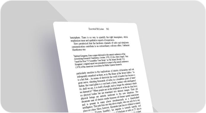 Essential McLuhan 362 hemisphere. There is no way to quantify the right hemisphere, which emphasizes inner and qualitative aspects of experience. How paradoxical that the hardware channels of radio and telephonic communication contribute to an extraordinary software effect. Nathaniel Hawthorne was 5 Herbert Krugman, from a paper delivered to the annual conference of the Advertising Research Foundation, October 1978. Cf. also, Barry Siegel, “Stay Tuned for How TV Scrambles Your Brain,” in The Miami Herald, C10. Krugman’s original report was presented as a paper to the annual conference (1970) of the American Association for Public Opinion Research. particularly sensitive to the implications of electric information and not infrequently remarked on them, as in The House of the Seven Gables: “Is it a fact that …by means of electricity the world of matter has become a great nerve, vibrating thousands of miles in a breathless point of time? Rather, the round globe is a vast head, a brain, instinct with intelligence! Or, shall we say, it is itself a thought, and no longer the substance which we deemed it!” When people are on the telephone or on the air, they have no physical bodies but are translated into abstract images. Their old physical beings are entirely irrelevant to the new situations. The discarnate user of electric media bypasses all former spatial restrictions and is present in many places simultaneously as a disembodied intelligence. This puts him one step above angels, who can only be in one place at a time. Since, however, discarnate man has no relation to natural law (or to Western lineality), his impulse is towards anarchy and lawlessness. Minus his body, the user of telephone or radio or TV also is minus his private identity, an effect that is becoming increasingly evident. In another experiment, an audience was equally divided, with each half seated facing a translucent-opaque screen placed in the middle of a room. A movie was shown, and then the audience was asked to write a brief response. One group saw light reflected from the screen in the usual manner; the other group saw light passing through the screen, as with television. In their remarks, the “light-on” group adopted an objective, detached tone, and was analytic as to narrative, continuity, cinematography, editing and workmanship, and so on. Whereas they reported “how the movie looked,” by contrast, the “light-through” group was mainly concerned with “how the movie felt.” Their responses were subjective and emotional: they discussed themselves, how they felt, and the mystical or archetypal significance of characters or actions. The differences between the light-on and the light-through situations (immediate ground) were sufficiently potent to cause one group to have a right-hemisphere experience and the other to have a left-hemisphere experience. With the low-intensity mosaic TV image, this effect is greatly amplified.