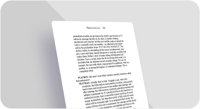 Playboy interview 243 unabashed sexuality are growing in the electric age because as TV tattoos its message directly on our skins, it renders clothing obsolescent and a barrier, and the new tactility makes it natural for kids to constantly touch one another—as reflected by the button sold in the psychedelic shops: IF IT MOVES, FONDLE IT. The electric media, by stimulating all the senses simultaneously, also give a new and richer sensual dimension to everyday sexuality that makes Henry Miller’s style of randy rutting old-fashioned and obsolete. Once a society enters the all-involving tribal mode, it is inevitable that our attitudes toward sexuality change. We see, for example, the ease with which young people live guiltlessly with one another, or, as among the hippies, in communal ménages. This is completely tribal. PLAYBOY: But aren’t most tribal societies sexually restrictive rather than permissive? McLUHAN: Actually, they’re both. Virginity is not, with a few exceptions, the tribal style in most primitive societies; young people tend to have total sexual access to one another until marriage. But after marriage, the wife becomes a jealously guarded possession and adultery a paramount sin. It’s paradoxical that in the transition to a retribalized society, there is inevitably a great explosion of sexual energy and freedom; but when that society is fully realized, moral values will be extremely tight. In an integrated tribal society, the young will have free rein to experiment, but marriage and the family will become inviolate institutions, and infidelity and divorce will constitute serious violations of the social bond, not a private deviation but a collective insult and loss of face to the entire tribe. Tribal societies, unlike detribalized, fragmented cultures with their stress on individualist values, are extremely austere morally, and do not hesitate to destroy or banish those who offend the tribal values. This is rather harsh, of course, but at the same time, sexuality can take on new and richer dimensions of depth involvement in a tribalized society. Today, meanwhile, as the old values collapse and we see an exhilarating release of pent-up sexual frustrations, we are all inundated by a tidal wave of emphasis on sex. Far from liberating the libido, however, such onslaughts seem to have induced jaded attitudes and a kind of psychosexual Weltschmerz. No sensitivity of sensual response can survive such an assault, which stimulates the mechanical view of the body as capable of experiencing specific thrills, but not total sexualemotional involvement and transcendence. It contributes to the schism between sexual enjoyment and reproduction that is so prevalent, and also strengthens the case for homosexuality. Projecting current trends, the love machine would appear a natural development in the near future—not just the current computerized datefinder, but a machine whereby ultimate