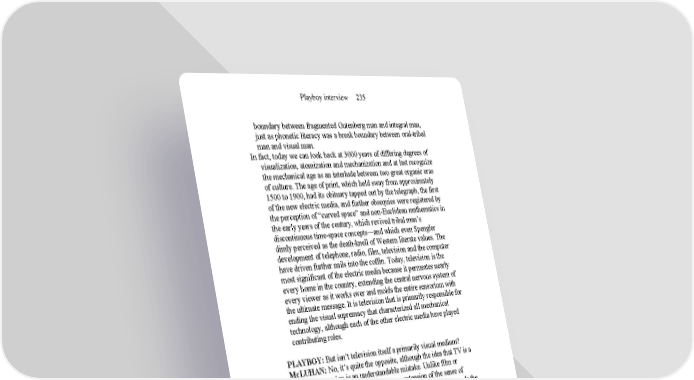 Playboy interview 235 boundary between fragmented Gutenberg man and integral man, just as phonetic literacy was a break boundary between oral-tribal man and visual man. In fact, today we can look back at 3000 years of differing degrees of visualization, atomization and mechanization and at last recognize the mechanical age as an interlude between two great organic eras of culture. The age of print, which held sway from approximately 1500 to 1900, had its obituary tapped out by the telegraph, the first of the new electric media, and further obsequies were registered by the perception of “curved space” and non-Euclidean mathematics in the early years of the century, which revived tribal man’s discontinuous time-space concepts—and which even Spengler dimly perceived as the death-knell of Western literate values. The development of telephone, radio, film, television and the computer have driven further nails into the coffin. Today, television is the most significant of the electric media because it permeates nearly every home in the country, extending the central nervous system of every viewer as it works over and molds the entire sensorium with the ultimate message. It is television that is primarily responsible for ending the visual supremacy that characterized all mechanical technology, although each of the other electric media have played contributing roles. PLAYBOY: But isn’t television itself a primarily visual medium? McLUHAN: No, it’s quite the opposite, although the idea that TV is a visual extension is an understandable mistake. Unlike film or photograph, television is primarily an extension of the sense of touch rather than of sight, and it is the tactile sense that demands the greatest interplay of all the senses. The secret of TV’s tactile power is that the video image is one of low intensity or definition and thus, unlike either photograph or film, offers no detailed information about specific objects but instead involves the active participation of the viewer. The TV image is a mosaic mesh not only of horizontal lines but of millions of tiny dots, of which the viewer is physiologically able to pick up only 50 or 60 from which he shapes the image; thus he is constantly filling in vague and blurry images, bringing himself into in-depth involvement with the screen and acting out a constant creative dialog with the iconoscope. The contours of the resultant cartoonlike image are fleshed out within the imagination of the viewer, which necessitates great personal involvement and participation; the viewer, in fact, becomes the screen, whereas in film he becomes the camera. By requiring us to constantly fill in the spaces of the mosaic mesh, the iconoscope is tattooing its message directly on our skins. Each viewer is thus an unconscious pointillist painter like Seurat, limning new shapes and images as the iconoscope washes over his entire body. Since the