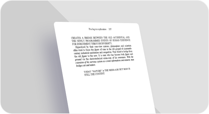 Pro-log to exploration 357 CREATES A BRIDGE BETWEEN THE OLD ACCIDENTAL AND THE NEWLY PROGRAMMED EVENTS OF HUMAN EXISTENCE FOR ENRICHMENT THROUGH DIVERSITY. Hypnotized by their rear-view mirrors, philosophers and scientists alike tried to focus the figure of man in the old ground of nineteenth- century industrial mechanism and congestion. They failed to bridge from the old figure to the new. It is man who has become both figure and ground via the electrotechnical exten-sion of his awareness. With the extension of his nervous system as a total information environment, man bridges art and nature. TODAY “NATURE” is THE MESS-AGE BUT MAN IS STILL THE CONTENT