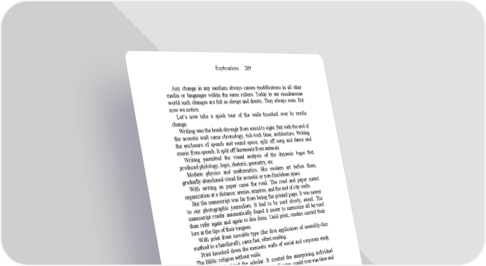 Explorations 289 Any change in any medium always causes modifications in all other media or languages within the same culture. Today in our simultaneous world such changes are felt as abrupt and drastic. They always were. But now we notice. Let’s now take a quick tour of the walls knocked over by media change. Writing was the break-through from sound to sight. But with the end of the acoustic wall came chronology, tick-tock time, architecture. Writing, the enclosure of speech and sound space, split off song and dance and music from speech. It split off harmonia from mimesis. Writing permitted the visual analysis of the dynamic logos that produced philology, logic, rhetoric, geometry, etc. Modern physics and mathematics, like modern art before them, gradually abandoned visual for acoustic or non-Euclidean space. With writing on paper came the road. The road and paper meant organization at a distance: armies, empires, and the end of city walls. But the manuscript was far from being the printed page. It was nearer to our photographic journalism. It had to be read slowly, aloud. The manuscript reader automatically found it easier to memorize all he read than refer again and again to this form. Until print, readers carried their lore at the tips of their tongues. With print from movable type (the first application of assembly-line method to a handicraft), came fast, silent reading. Print knocked down the monastic walls of social and corporate study. The Bible: religion without walls. But print isolated the scholar. It created the enterprising individual who, like Marlowe’s Tamburlaine or Dr. Faustus, could over-run time and history and cultures and peoples. Print evoked the walls of the classroom. Print could channel so much information to the individual that had previously been in the mind and memory of the teacher alone, that it upset all existing educational procedures. It upset the monopoly of Latin by making possible multi-lingual study. It fostered the vernaculars and enlarged the walls between nations. It speeded up language, thereby setting new walls between speech and song, and song and instrumentation. Print led to spoken poetry and silently read poetry, thus changing the nature of verse entirely. Printed music entirely changed the structures of musical forms. In America print and book-culture became the dominant form from the beginning, setting walls between literature and art, and art and life, which were less obvious in Europe. In America print was a technological matrix of all subsequent invention. Its assembly-lines finally reached expression in Detroit and the motor-car: the home without walls.