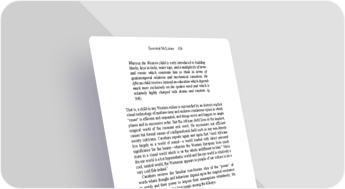 Essential McLuhan 108 Whereas the Western child is early introduced to building blocks, keys in locks, water taps, and a multiplicity of items and events which constrain him to think in terms of spatiotemporal relations and mechanical causation, the African child receives instead an education which depends much more exclusively on the spoken word and which is relatively highly charged with drama and emotion. (p. 308) That is, a child in any Western milieu is surrounded by an abstract explicit visual technology of uniform time and uniform continuous space in which “cause” is efficient and sequential, and things move and happen on single planes and in successive order. But the African child lives in the implicit, magical world of the resonant oral word. He encounters not efficient causes but formal causes of configurational field such as any non-literate society cultivates. Carothers repeats again and again that “rural Africans live largely in a world of sound—a world loaded with direct personal significance for the hearer—whereas the Western European lives much more in a visual world which is on the whole indifferent to him.” Since the ear world is a hot hyperesthetic world and the eye world is relatively a cool, neutral world, the Westerner appears to people of ear culture to be a 2 very cold fish indeed. Carothers reviews the familiar non-literate idea of the “power” of words where thought and behaviour depend upon the magical resonance in words and their power to impose their assumptions relentlessly. He cites Kenyatta concerning love magic among the Kikuyu: It is very important to acquire the correct use of magical words and their proper intonations, for the progress in applying magic effectively depends on uttering these words in their ritual order…. In performing these acts of love magic the performer has to recite a magical formula…. After this recitation he calls the name of the girl loudly and starts to address her as though she were listening. (p. 309) It is a matter of “rite words in rote order,” as Joyce put it. But once more any Western child today grows up in this kind of magical repetitive world as he hears advertisements on radio and TV. Carothers next asks (p. 310) how literacy in a society might operate to effect the change from the notion of words as resonant, live, active, natural forces to the 2 See chapter on “Acoustic Space” by E.Carpenter and H.M.McLuhan in Explorations in Communication, pp. 65–70. notion of words as “meaning” or “significance” for minds: