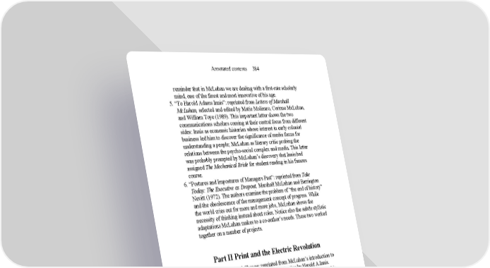Annotated contents 384 reminder that in McLuhan we are dealing with a first-rate scholarly mind, one of the finest and most innovative of his age. 5. “To Harold Adams Innis”: reprinted from Letters of Marshall McLuhan, selected and edited by Matie Molinaro, Corinne McLuhan, and William Toye (1989). This important letter shows the two communications scholars coming at their central focus from different sides: Innis as economic historian whose interest in early colonial business led him to discover the significance of media forms for understanding a people; McLuhan as literary critic probing the relations between the psycho-social complex and media. This letter was probably prompted by McLuhan’s discovery that Innis had assigned The Mechanical Bride for student reading in his famous course. 6. “Postures and Impostures of Managers Past”: reprinted from Take Today: The Executive as Dropout, Marshall McLuhan and Barrington Nevitt (1972). The authors examine the problem of “the end of history” and the obsolescence of the management concept of progress. While the world cries out for more and more jobs, McLuhan shows the necessity of thinking instead about roles. Notice also the subtle stylistic adaptations McLuhan makes to a co-author’s needs. These two worked together on a number of projects. Part II Print and the Electric Revolution 7. Media and Cultural Change: reprinted from McLuhan’s introduction to the 1964 edition of The Bias of Communication by Harold A.Innis. McLuhan’s perceptive introduction drew considerable attention to this book. When he says that he is pleased to think of his own The Gutenberg Galaxy “as a footnote to the observations of Innis,” it is a classic piece of McLuhanesque deferential litotes—as any careful reader of his analysis of Innis can see. This material also presents some of the most richly provocative insights one can find anywhere in McLuhan’s work. At one level it is an imploded and comprehensive history of media and cultural change. 8. The Gutenberg Galaxy: reprinted from The Gutenberg Galaxy: The Making of Typographic Man (1962), perhaps the most important book ever written on the revolution of print technology. The insights into the process of print and its effects are profoundly significant. The Gutenberg Galaxy is McLuhan’s masterpiece and the sine qua non of literate understanding of the power of a technology to create the conditions for Western civilized power. It may look like an anti-book in its structure, an array of parts like a mosaic, but there is more traditional internal structure than may at first appear. Certainly there is less argument here and more pattern recognition.