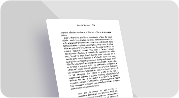 Essential McLuhan 364 sequence, stimulates dominance of this area of the brain in cultural patterns. Luria’s observations provide an understanding of how the written alphabet, with its lineal structure, was able to create conditions conducive to the development of Western science, technology, and rationality. Many left-hemisphere stroke patients become aphasic, losing some or all of their ability to speak or to write, in some cases also losing the capacity for sustained (sequential) thought. They seem to become “astonied” (fifteenth-century English), or “stunned”—the experience is not unlike being “stoned” on drugs. In part, this may be the result of a loss of muscular motor control. But much of it is directly related to the inner- outer split between the hemispheres and to linearity as a feature of the left side of the brain. Speech and writing have to be uttered in a sequence. Just as all forms of sequential activity (as contrasted to configuration or pattern) are functions of the left hemisphere, so too all forms of utterances (and artefacts), whether technological or verbal or written, are functions of the left hemisphere. This extends to private identity—and to entrepreneurial aggression of all kinds. Conversely, all technologies that emphasize the outer or the abstract or sequentiality in organizing experience, contribute to left-hemisphere dominance in a culture. Harold Innis remarked on the Oriental (right-hemisphere) antipathy to sequence and abstraction and our sort of precision: Social time, for example, has been described as qualitatively differentiated according to the beliefs and customs common to a group and as not continuous but as subject to interruption of actual dates. It is influenced by language which constrains and fixes prevalent concepts and modes of thought. It has been argued by Marcel Granet that the Chinese are not equipped to note concepts or to present doctrines discursively. The Word does not fix a notion with a definite degree of abstraction or generality but evokes an indefinite complex of particular images. It is completely unsuited to formal precision. Neither time nor space is abstractly conceived: time proceeds by cycles and is round. (The Bias of Communication, 62) Dr. Bogen noted, appositely, “what may well be the most important distinction between the left and right hemisphere modes is the extent to which a linear concept of time participates in the ordering of thought” (The Human Brain, 141). The visual power of the phonetic alphabet to translate other languages into itself is part of its power to invade right-hemisphere (oral) cultures.