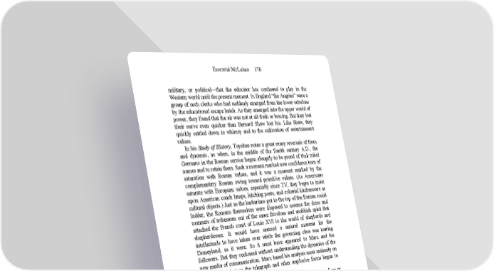 Essential McLuhan 170 military, or political—that the educator has continued to play in the Western world until the present moment. In England “the Angries” were a group of such clerks who had suddenly emerged from the lower echelons by the educational escape hatch. As they emerged into the upper world of power, they found that the air was not at all fresh or bracing. But they lost their nerve even quicker than Bernard Shaw lost his. Like Shaw, they quickly settled down to whimsy and to the cultivation of entertainment values. In his Study of History, Toynbee notes a great many reversals of form and dynamic, as when, in the middle of the fourth century A.D., the Germans in the Roman service began abruptly to be proud of their tribal names and to retain them. Such a moment marked new confidence born of saturation with Roman values, and it was a moment marked by the complementary Roman swing toward primitive values. (As Americans saturate with European values, especially since TV, they begin to insist upon American coach lamps, hitching posts, and colonial kitchenware as cultural objects.) Just as the barbarians got to the top of the Roman social ladder, the Romans themselves were disposed to assume the dress and manners of tribesmen out of the same frivolous and snobbish spirit that attached the French court of Louis XVI to the world of shepherds and shepherdesses. It would have seemed a natural moment for the intellectuals to have taken over while the governing class was touring Disneyland, as it were. So it must have appeared to Marx and his followers. But they reckoned without understanding the dynamics of the new media of communication. Marx based his analysis most untimely on the machine, just as the telegraph and other implosive forms began to reverse the mechanical dynamic. The present chapter is concerned with showing that in any medium or structure there is what Kenneth Boulding calls a “break boundary at which the system suddenly changes into another or passes some point of no return in its dynamic processes.” Several such “break boundaries” will be discussed later, including the one from stasis to motion, and from the mechanical to the organic in the pictorial world. One effect of the static photo had been to suppress the conspicuous consumption of the rich, but the effect of the speed-up of the photo had been to provide fantasy riches for the poor of the entire globe. Today the road beyond its break boundary turns cities into highways, and the highway proper takes on a continuous urban character. Another characteristic reversal after passing a road break boundary is that the country ceases to be the center of all work, and the city ceases to be the center of leisure. In fact, improved roads and transport have reversed the ancient pattern and made cities the centers of work and the country the place of leisure and of recreation. Earlier, the increase of traffic that came with money and roads had ended the static tribal state (as Toynbee calls the nomadic food-gathering culture). Typical of the reversing that occurs at break boundaries is the