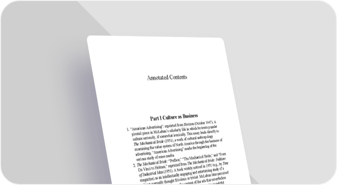 Annotated Contents Part I Culture as Business 1. “American Advertising”: reprinted from Horizon (October 1947). A pivotal piece in McLuhan’s scholarly life in which he treats popular culture seriously, if somewhat ironically. This essay leads directly to The Mechanical Bride (1951), a work of cultural anthropology examining the value system of North America through the business of advertising. “American Advertising” marks the beginning of the serious study of mass media. 2. The Mechanical Bride: “Preface,” “The Mechanical Bride,” and “From Da Vinci to Holmes,” reprinted from The Mechanical Bride: Folklore of Industrial Man (1951). A book widely noticed in 1951 (e.g., by Time magazine) as an intellectually engaging and entertaining study of a subject normally thought frivolous or trivial. McLuhan later perceived a too-concentrated focus on the content of the ads that nevertheless afforded him scope for social criticism and some witty insightful wordplay in deconstructing the ads. 3. “Culture Is Our Business”: reprinted from the book of the same title (1970). The money-making ethos of North American advertising is examined in this continuation of serious interest in popular culture and the arts. In respect to the growth of our mass consumer society, McLuhan reminds us that even T.S.Eliot once addressed 14,000 people in a sports stadium. This book traces the truth about North American culture—its obsession with business. (Curiously, this book was hastened through the publication process so rapidly that the author never got to proofread it or correct errors. It is reproduced here as first printed, errors intact.) 4. “Joyce, Mallarmé, and the Press”: reprinted from The Interior Landscape: The Literary Criticism of Marshall McLuhan, edited by Eugene McNamara (1969). This prescient essay, which originally appeared in the Sewanee Review, 1953, marries the most serious literary considerations with the study of mass media. It is an excellent example of McLuhan’s ability to find serious meaning in contemporary culture. The collected essays, often ignored by critics, are a stunning