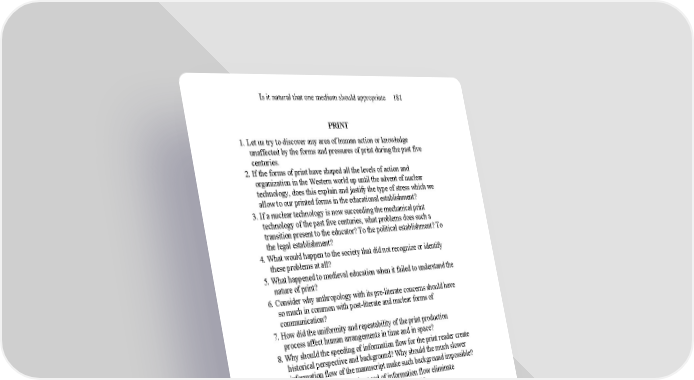 Is it natural that one medium should appropriate 181 PRINT 1. Let us try to discover any area of human action or knowledge unaffected by the forms and pressures of print during the past five centuries. 2. If the forms of print have shaped all the levels of action and organization in the Western world up until the advent of nuclear technology, does this explain and justify the type of stress which we allow to our printed forms in the educational establishment? 3. If a nuclear technology is now succeeding the mechanical print technology of the past five centuries, what problems does such a transition present to the educator? To the political establishment? To the legal establishment? 4. What would happen to the society that did not recognize or identify these problems at all? 5. What happened to medieval education when it failed to understand the nature of print? 6. Consider why anthropology with its pre-literate concerns should have so much in common with post-literate and nuclear forms of communication? 7. How did the uniformity and repeatability of the print production process affect human arrangements in time and in space? 8. Why should the speeding of information flow for the print reader create historical perspective and background? Why should the much slower information flow of the manuscript make such background impossible? 9. Why should the electronic speed of information flow eliminate historical background in favor of “you are there”? 10. Why is homogeneity of space and time arrangement natural under print conditions of learning? 11. Why was it revolutionary for Columbus to assume that he could keep moving in a straight line, in one direction? Why are there no straight lines in medieval maps? Why was it unthinkable for them that space should be continuous and homogeneous? 12. Why should the Columbus pursuit of the straight line in navigation have been necessary in order to discover the round earth? 13. Are the flat-earthers on strong ground in terms of our Western devotion to Euclidean space? 14. In garment-making and hence in clothing styles, the straight seam was impossible before the sewing machine. Trace some of the implications of the straight line and of mechanism in one or more other fields of human organization. 15. How much is our notion of “content” affected in the case of printing by the blank page as filled with moveable type?