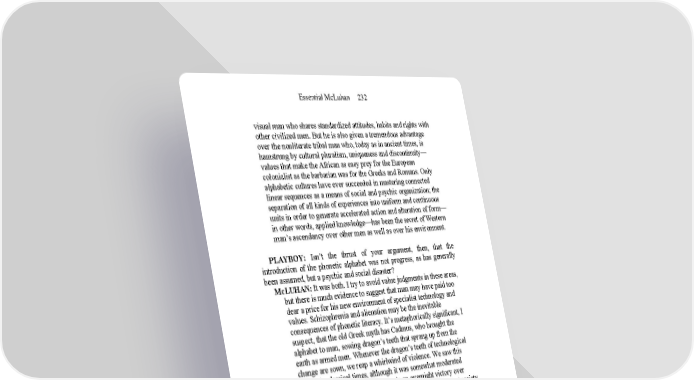 Essential McLuhan 232 visual man who shares standardized attitudes, habits and rights with other civilized men. But he is also given a tremendous advantage over the nonliterate tribal man who, today as in ancient times, is hamstrung by cultural pluralism, uniqueness and discontinuity— values that make the African as easy prey for the European colonialist as the barbarian was for the Greeks and Romans. Only alphabetic cultures have ever succeeded in mastering connected linear sequences as a means of social and psychic organization; the separation of all kinds of experiences into uniform and continuous units in order to generate accelerated action and alteration of form— in other words, applied knowledge—has been the secret of Western man’s ascendancy over other men as well as over his environment. PLAYBOY: Isn’t the thrust of your argument, then, that the introduction of the phonetic alphabet was not progress, as has generally been assumed, but a psychic and social disaster? McLUHAN: It was both. I try to avoid value judgments in these areas, but there is much evidence to suggest that man may have paid too dear a price for his new environment of specialist technology and values. Schizophrenia and alienation may be the inevitable consequences of phonetic literacy. It’s metaphorically significant, I suspect, that the old Greek myth has Cadmus, who brought the alphabet to man, sowing dragon’s teeth that sprang up from the earth as armed men. Whenever the dragon’s teeth of technological change are sown, we reap a whirlwind of violence. We saw this clearly in classical times, although it was somewhat moderated because phonetic literacy did not win an overnight victory over primitive values and institutions; rather, it permeated ancient society in a gradual, if inexorable, evolutionary process. PLAYBOY: How long did the old tribal culture endure? McLUHAN: In isolated pockets, it held on until the invention of printing in the 16th Century, which was a vastly important qualitative extension of phonetic literacy. If the phonetic alphabet fell like a bombshell on tribal man, the printing press hit him like a 100-megaton H-bomb. The printing press was the ultimate extension of phonetic literacy: Books could be reproduced in infinite numbers; universal literacy was at last fully possible, if gradually realized; and books became portable individual possessions. Type, the prototype of all machines, ensured the primacy of the visual bias and finally sealed the doom of tribal man. The new medium of linear, uniform, repeatable type reproduced information in unlimited quantities and at hitherto-impossible speeds, thus assuring the eye a position of total predominance in man’s sensorium. As a drastic extension of man, it shaped and transformed his entire environment, psychic and social, and was