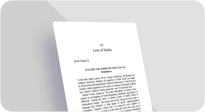 19 Laws of Media [From Chapter 2] CULTURE AND COMMUNICATION: The Two Hemispheres To the Inuit, truth is given, not by “seeing is believing,” but through oral tradition, mysticism, intuition, all cognition—in other words, not simply by observation and measurement of physical phenomena. To the Inuit, the ocularly visible apparition is not nearly so common as the purely auditory one; “hearer” would be a better name than “seer” for their holy men. 1 Robert Trotter, writing on “The Other Hemisphere” in Science News, reports an investigation of brain-hemisphere dominance and patterns of behaviour “among the Inuit or Eskimo people of Baffin Island in northeastern Canada.” The project discovered, among the Inuit people, a language that reflected “a high degree of spatial, right-hemispheric orientation. Linguistic studies rate it as being the most synthetic of languages. American English is at the other end of the same scale, and is rated as the most analytic (left-hemisphere).” Inuit sculptures, lithographs, and tapestries are “without apparent linear or three-dimension analytic orientation.” That is, they have never developed any measure of visual bias such as is normal to Western culture. Reproduced courtesy of R.H.Trotter