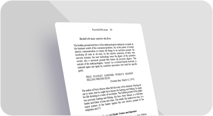 Essential McLuhan 80 Sheshell ebb music wayriver she flows. The hidden ground and force of the anthropological enterprise, as much as the business world of the consumer-producer, lay in the power of instant electric communication to restore all things to an inclusive present. By involving all men in all men, by the electric extension of their own nervous systems, the new technology turns the figure of the primitive society into a universal ground that buries all previous figures. The naïveté of the anthropologists, “secure” in a civilized literate stockade, is matched again and again by would-be innovators who head for specific goals: ERLE STANLEY GARDNER WORLD’S BIGGEST SELLING WRITER DEAD (Toronto Star, March 12, 1970) The author of Perry Mason often felt the irony of his situation. Having set out to write, that he might have leisure for hunting and fishing, he spent his life dictating to a team of secretaries. The hidden ground of his plight was precisely hunting and fishing. His hero, Perry Mason, is a full-time hunter and fisher of men and clues. The sleuth, the undercover man, is a major posture of the hunter against the new electric ground of the telephone and TV. Man Hunter and Sleuth: Posture and Imposture In one of Sherlock Holmes’s adventures his quarry demurs when Holmes declares that he had seen him at a particular spot. The quarry retorts that “I saw nobody following me there.” And Holmes comments, “That is what you may expect to see when I follow you.” Half the world today is engaged in keeping the other half “under surveillance.” This, in fact, is the hang-up of the age of “software” and information. In the preceding “hardware” age the “haves” of the world had kept the “have-nots” under “surveillance.” This old beat for flatfoots has now been relegated to the world of popular entertainment. The police state is no work of art, a bureaucratic ballet of undulating sirens. That is a way of seeing that the espionage activities of our multitudinous man hunters “crediting” agencies are not only archaic, but redundant and irrelevant. GALLUPING ESPIONAGE CREATES THE UNPERSON! THE MAN THAT NEVER WAS POSTURE AND IMPOSTURE AS WAYS OF LIFE NOW MERGE IN THE GLOBAL THEATER