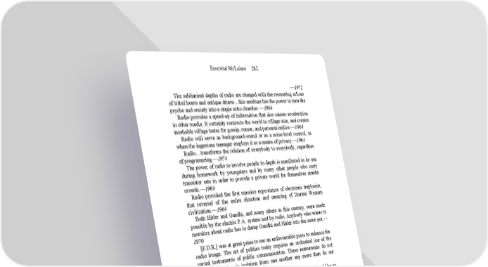 Essential McLuhan 282 —1972 The subliminal depths of radio are charged with the resonating echoes of tribal horns and antique drums…this medium has the power to turn the psyche and society into a single echo chamber.—1964 Radio provides a speed-up of information that also causes acceleration in other media. It certainly contracts the world to village size, and creates insatiable village tastes for gossip, rumor, and personal malice.—1964 Radio will serve as background-sound or as a noise-level control, as when the ingenious teenager employs it as a means of privacy.—1964 Radio…transforms the relation of everybody to everybody, regardless of programming.—1974 The power of radio to involve people in-depth is manifested in its use during homework by youngsters and by many other people who carry transistor sets in order to provide a private world for themselves amidst crowds.—1964 Radio provided the first massive expe-rience of electronic implosion, that reversal of the entire direction and meaning of literate Western civilization.—1964 Both Hitler and Gandhi, and many others in this century, were made possible by the electric P.A. system and by radio. Anybody who wants to moralize about radio has to dump Gandhi and Hitler into the same pot.— 1970 [F.D.R.] was at great pains to use an unfavourable press to enhance his radio image. The art of politics today requires an orchestral use of the varied instruments of public communication. These instruments do not exist or function in isolation from one another any more than do our senses function in isolation.—1965 It is not easy to explain to a Westerner why oral cultures should be so rabid in their response to radio. The oral man cannot tolerate radio any more than he can tolerate alcohol… His very culture is already profoundly involving, and radio and alcohol excite the tribal membrane of the oral cultures to a morbid degree.—1972 I live right inside radio when I listen. —1964 Radio, in contrast to the telephone, permits the listener to fill in a good deal of visual imagery. The radio-announcer or disc-jockey stands out loud and clear, while the voice on the telephone resonates in isolation from the visual sense. Nobody ever wrote a lament about “All Alone by the Radio” but “All Alone by the Telephone” is a classic of the twenties that was a resounding prophecy of high-rise living in the present time.— 1971 XEROGRAPHY Any notable figure has only to empty his Xeroxed memos into the publisher’s office to have a biography available in a few hours.—1971