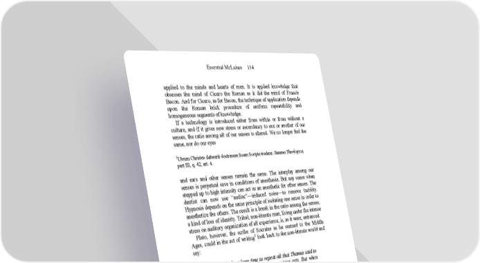 Essential McLuhan 114 applied to the minds and hearts of men. It is applied knowledge that obsesses the mind of Cicero the Roman as it did the mind of Francis Bacon. And for Cicero, as for Bacon, the technique of application depends upon the Roman brick procedure of uniform repeatability and homogeneous segments of knowledge. If a technology is introduced either from within or from without a culture, and if it gives new stress or ascendancy to one or another of our senses, the ratio among all of our senses is altered. We no longer feel the same, nor do our eyes 3 Utrum Christus debuerit doctrinam Suam Scripto tradere. Summa Theologica, part III, q. 42, art. 4. and ears and other senses remain the same. The interplay among our senses is perpetual save in conditions of anesthesia. But any sense when stepped up to high intensity can act as an anesthetic for other senses. The dentist can now use “audiac”—induced noise—to remove tactility. Hypnosis depends on the same principle of isolating one sense in order to anesthetize the others. The result is a break in the ratio among the senses, a kind of loss of identity. Tribal, non-literate man, living under the intense stress on auditory organization of all experience, is, as it were, entranced. Plato, however, the scribe of Socrates as he seemed to the Middle Ages, could in the act of writing4 look back to the non-literate world and say: It would take a long time to repeat all that Thamus said to Theuth in praise or blame of the various arts. But when they came to letters, This, said Theuth, will make the Egyptians wiser and give them better memories; it is a specific both for the memory and for the wit. Thamus replied: O most ingenious Theuth, the parent or inventor of an art is not always the best judge of the utility or inutility of his own inventions to the users of them. And in this instance, you who are the father of letters, from a paternal love of your own children have been led to attribute to them a quality which they cannot have; for this discovery of yours will create forgetfulness in the learners’ souls, because they will not use their memories; they will trust to the external written characters and not remember of themselves. The specific which you have discovered is an aid not to memory, but to reminiscence, and you give your disciples not truth, but only the semblance of truth; they will be hearers of many things and will have learned nothing; they will appear to be omniscient and will generally know nothing; they will be tiresome company, having the show of wisdom without the reality.