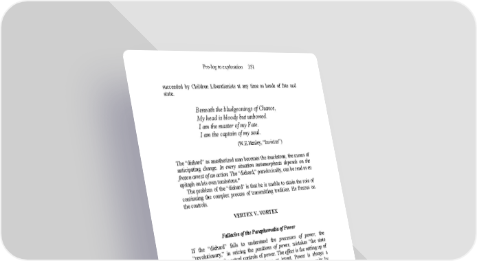 Pro-log to exploration 351 succeeded by Children Liberationists at any time as heads of fate and state. Beneath the bludgeonings of Chance, My head is bloody but unbowed. I am the master of my Fate. I am the captain of my soul. (W.E.Henley, “Invictus”) The “diehard” as anesthetized man becomes the touchstone, the means of anticipating change. In every situation metamorphosis depends on the frozen arrest of an action. The “diehard,” paradoxically, can be read as an epitaph on his own tombstone.* The problem of the “diehard” is that he is unable to attain the role of continuing the complex process of transmitting tradition. He freezes on the controls. VERTEX V. VORTEX Fallacies of the Paraphernalia of Power If the “diehard” fails to understand the processes of power, the “revolutionary,” in seizing the positions of power, mistakes “the state apparatus” for the actual controls of power. The effect is the setting up of a “police state” regardless of ideology or intent. Power is always a relationship, the putting on of the vortex of the living community by becoming an acceptable service environment. The components that go into this mask of power must, therefore, vary according to the character of the communities. A wearable or bearable “mask of power” must comprise all the principal features and postures inherent in the life of the community. Today, on the other hand, it is a natural mistake of revolutionaries to take over the new service environments of press, radio, and TV. These cannot possibly wear the recognizable visage of deep currents of experience or feeling. Numerous shortcuts to power now loom as we learn to do more with less. Actually, this is the time when more and more awareness is demanded of everybody. When everyone is more and more involved in the information environment and in the creative process of discovery and innovation, the old divisions of work, play, and idleness disappear. The creative worker is never more powerful or more at leisure, never more the dropout from the specialist job, than when using all his faculties. We are entering a time of dialogue and heightened human awareness *For more on this theme of transformation and innovation, see “Narcissus and Narcosis” in Understanding Media by Marshall McLuhan.
