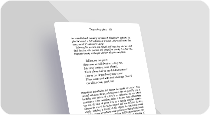 The gutenberg galaxy 101 up a constitutional monarchy by means of delegating by authority. His plan for himself is that he become a specialist: Only we still retain “The name, and all th’ additions to a King.” Following his specialist cue, Goneril and Regan leap into the act of filial devotion with specialist and competitive intensity. It is Lear who fragments them by insisting on a divisive eulogistic competition: Tell me, my daughters (Since now we will divest us, both of rule, Interest of territory, cares of state), Which of you shall we say doth love us most? That we our largest bounty may extend Where nature doth with merit challenge. Goneril Our eldest-born, speak first. Competitive individualism had become the scandal of a society long invested with corporate and collective values. The role played by print in instituting new patterns of culture is not unfamiliar. But one natural consequence of the specializing action of the new forms of knowledge was that all kinds of power took on a strongly centralist character. Whereas the role of the feudal monarch had been inclusive, the king actually including in himself all his subjects, the Renaissance prince tended to become an exclusive power centre surrounded by his individual subjects. And the result of such centralism, itself dependent on many new developments in roads and commerce, was the habit of delegation of powers and the specializing of many functions in separate areas and individuals. In King Lear, as in other plays, Shakespeare shows an utter clairvoyance concerning the social and personal consequences of denudation and stripping of attributes and functions for the sake of speed, precision, and increased power. His insights appear so richly in his lines that it is very difficult to select among them. But with the very opening words of Goneril’s aria we are deep in them: I love you more than words can wield the matter; Dearer than eyesight, space, and liberty: The stripping of the very human senses themselves will be one of the themes of this play. The separation of sight from the other senses has already been stressed in Lear’s expression of his “darker purpose” and his resort to the mere visual map. But whereas Goneril is ready to strip off sight as an expression of devotion, Regan rallies to her challenge with: