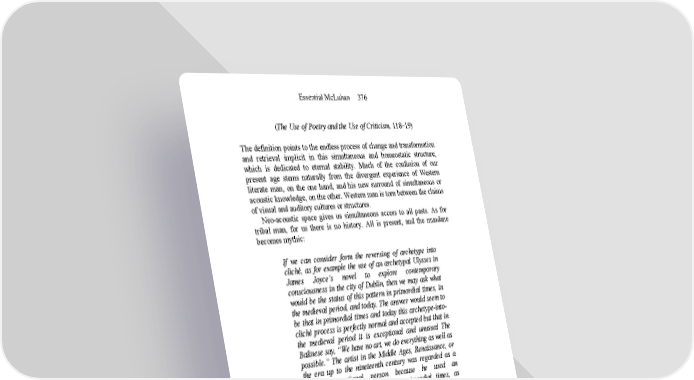 Essential McLuhan 376 (The Use of Poetry and the Use of Criticism, 118–19) The definition points to the endless process of change and transformation and retrieval implicit in this simultaneous and homeostatic structure, which is dedicated to eternal stability. Much of the confusion of our present age stems naturally from the divergent experience of Western literate man, on the one hand, and his new surround of simultaneous or acoustic knowledge, on the other. Western man is torn between the claims of visual and auditory cultures or structures. Neo-acoustic space gives us simultaneous access to all pasts. As for tribal man, for us there is no history. All is present, and the mundane becomes mythic: If we can consider form the reversing of archetype into cliché, as for example the use of an archetypal Ulysses in James Joyce’s novel to explore contemporary consciousness in the city of Dublin, then we may ask what would be the status of this pattern in primordial times, in the medieval period, and today. The answer would seem to be that in primordial times and today this archetype-into- cliché process is perfectly normal and accepted but that in the medieval period it is exceptional and unusual The Balinese say, “We have no art, we do everything as well as possible.” The artist in the Middle Ages, Renaissance, or the era up to the nineteenth century was regarded as a unique, exceptional person because he used an exceptional, unusual process. In primordial times, as today, the artist uses a familiar, ordinary technique and so he is looked upon as an ordinary, familiar person. Every man today is in this sense an artist—the administrator, the scientist, the doctor, as well as the man who uses paint or sculpts stone. Just as the archaic man had to follow natural processes of rhythm in order to influence and to purge, cleanse them by ricorso, so modern electric technologies require such timing and precision that only the following of processes in nature can be tolerated. The immediately preceding centuries of mechanization had been able to bypass these processes by fragmentation and strip-mining kinds of procedures. (From Cliché to Archetype, 118–19) The fall or scrapping of a culture world puts us all into the same archetypal cesspool, engendering nostalgia for earlier conditions.