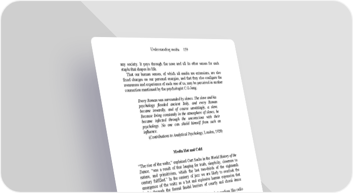 Understanding media 159 any society. It pays through the nose and all its other senses for each staple that shapes its life. That our human senses, of which all media are extensions, are also fixed charges on our personal energies, and that they also configure the awareness and experience of each one of us, may be perceived in another connection mentioned by the psychologist C.G.Jung: Every Roman was surrounded by slaves. The slave and his psychology flooded ancient Italy, and every Roman became inwardly, and of course unwittingly, a slave. Because living constantly in the atmosphere of slaves, he became infected through the unconscious with their psychology. No one can shield himself from such an influence. (Contributions to Analytical Psychology, London, 1928) Media Hot and Cold “The rise of the waltz,” explained Curt Sachs in the World History of the Dance, “was a result of that longing for truth, simplicity, closeness to nature, and primitivism, which the last two-thirds of the eighteenth century fulfilled.” In the century of jazz we are likely to overlook the emergence of the waltz as a hot and explosive human expression that broke through the formal feudal barriers of courtly and choral dance styles. There is a basic principle that distinguishes a hot medium like radio from a cool one like the telephone, or a hot medium like the movie from a cool one like TV. A hot medium is one that extends one single sense in “high definition.” High definition is the state of being well filled with data. A photograph is, visually, “high definition.” A cartoon is “low definition,” simply because very little visual information is provided. Telephone is a cool medium, or one of low definition, because the ear is given a meager amount of information. And speech is a cool medium of low definition, because so little is given and so much has to be filled in by the listener. On the other hand, hot media do not leave so much to be filled in or completed by the audience. Hot media are, therefore, low in participation, and cool media are high in participation or completion by the audience. Naturally, therefore, a hot medium like radio has very different effects on the user from a cool medium like the telephone. A cool medium like hieroglyphic or ideogrammic written characters has very different effects from the hot and explosive medium of the phonetic alphabet. The alphabet, when pushed to a high degree of abstract visual intensity, became typography. The printed word with its specialist intensity burst the bonds of medieval corporate guilds and monasteries, creating extreme individualist patterns of enterprise and monopoly. But