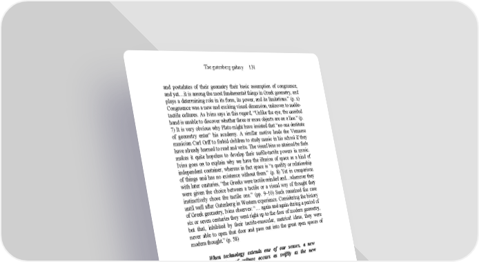 The gutenberg galaxy 131 and postulates of their geometry their basic assumption of congruence, and yet…it is among the most fundamental things in Greek geometry, and plays a determining role in its form, its power, and its limitations.” (p. x) Congruence was a new and exciting visual dimension, unknown to audile- tactile cultures. As Ivins says in this regard, “Unlike the eye, the unaided hand is unable to discover whether three or more objects are on a line.” (p. 7) It is very obvious why Plato might have insisted that “no one destitute of geometry enter” his academy. A similar motive leads the Viennese musician Carl Orff to forbid children to study music in his school if they have already learned to read and write. The visual bias so attained he feels makes it quite hopeless to develop their audile-tactile powers in music. Ivins goes on to explain why we have the illusion of space as a kind of independent container, whereas in fact space is “a quality or relationship of things and has no existence without them.” (p. 8) Yet in comparison with later centuries, “the Greeks were tactile minded and…whenever they were given the choice between a tactile or a visual way of thought they instinctively chose the tactile one.” (pp. 9–10) Such remained the case until well after Gutenberg in Western experience. Considering the history of Greek geometry, Ivins observes: “… again and again during a period of six or seven centuries they went right up to the door of modern geometry, but that, inhibited by their tactile-muscular, metrical ideas, they were never able to open that door and pass out into the great open spaces of modern thought.” (p. 58) When technology extends one of our senses, a new translation of culture occurs as swiftly as the new technology is interiorized. Although the main theme of this book is the Gutenberg Galaxy or a configuration of events, which lies far ahead of the world of alphabet and of scribal culture, it needs to be known why, without alphabet, there would have been no Gutenberg. And, therefore, we must get some insight into the conditions of culture and perception that make first, writing, and 9 then, perhaps, alphabet possible at all. 9 The Koreans by 1403 were making cast-metal type by means of punches and matrices (The Invention of Printing in China and its Spread Westward by T.F.Carter). Carter had no concern with the alphabet relation to print and was probably unaware that the Koreans are reputed to have a phonetic alphabet. Wilson’s account of the years of perceptual training needed to enable adult Africans to be able to see movies has its exact analogue in the difficulties which Western adults have with “abstract” art. In 1925 Bertrand Russell wrote his ABC of Relativity, pointing out on the first page that: