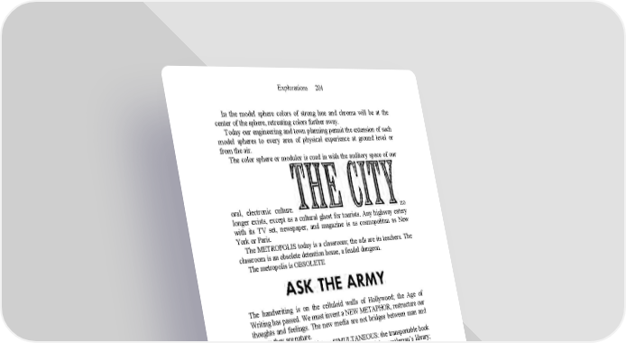 Explorations 201 In the model sphere colors of strong hue and chroma will be at the center of the sphere, retreating colors further away. Today our engineering and town planning permit the extension of such model spheres to every area of physical experience at ground level or from the air. The color sphere or modulor is cued in with the auditory space of our oral, electronic culture. no longer exists, except as a cultural ghost for tourists. Any highway eatery with its TV set, newspaper, and magazine is as cosmopolitan as New York or Paris. The METROPOLIS today is a classroom; the ads are its teachers. The classroom is an obsolete detention home, a feudal dungeon. The metropolis is OBSOLETE The handwriting is on the celluloid walls of Hollywood; the Age of Writing has passed. We must invent a NEW METAPHOR, restructure our thoughts and feelings. The new media are not bridges between man and nature: they are nature. Gutenberg made all history SIMULTANEOUS: the transportable book brought the world of the dead into the space of the gentleman’s library; the telegraph brought the entire world of the living to the workman’s breakfast table. NOBODY yet knows the language inherent in the in terms of the new situation. Our most impressive new technological culture; we are all deaf- blind mutes words and thoughts betray us by referring to the previously existent, not to the present.