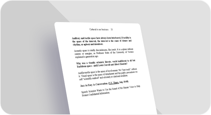 Cultural is our business 33 Auditory and tactile space have always been interleaved. If tactility is the space of the interval, the interval is the cause of closure and rhythm, or upbeat and downbeat. Acoustic space is totally discontinuous, like touch. It is a sphere without centers or margins, as Professor Botts of the University of Toronto explained a generation ago. Why was a visually oriented, literate, world indifferent to all but Euclidean space—until Lewis Carroll and Albert Einstein? Audile-tactile space is the space of involvement. We “lose touch” without it. Visual space is the space of detachment and the public precautions we call “scientific method” and scholarly or citational erudition. Jazz As Easy As Conversation. (N.Y. Times, Aug. 18/68) Speech Scientist Wants to Use the Sound of the Human Voice to Help Protect Confidential Information.