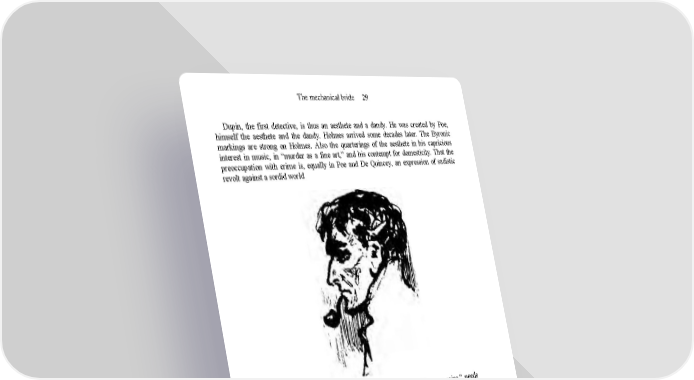The mechanical bride 29 Dupin, the first detective, is thus an aesthete and a dandy. He was created by Poe, himself the aesthete and the dandy. Holmes arrived some decades later. The Byronic markings are strong on Holmes. Also the quarterings of the aesthete in his capricious interest in music, in “murder as a fine art,” and his contempt for domesticity. That the preoccupation with crime is, equally in Poe and De Quincey, an expression of sadistic revolt against a sordid world devoted to money and the police protection of “ill-gotten gains,” needs very little investigation. That the lonely aesthete-detective is at once a rebel against the crude middle-class conformity and also a type of extreme initiative and the individualism helps however to explain the ambiguity of his appeal for the same middle class. He is at once a type of disinterested aristocratic superiority and of middle-class failure to create new social values. It is easy to note in this the same ambiguity that presides over commercial ads which feature simultaneously quality and cheapness, refinement and availability. However, a major feature of the modern sleuth notably absent from Poe’s Dupin is the quality of the manhunter. The superman features don’t change from Da Vinci to Byron and Heathcliff, but the man-hunting proclivities, the endless sniffing out along the road to the supreme metaphysical thrill of murder, are not evident until Holmes. Byron and Poe were content with the aura of incest as a mark and gesture of antisocial thrill and also of emotional avarice. Baudelaire, Rimbaud, and Wilde explored other sexual variants of the antisocial. But murder, the cerebral itch to hunt down the inmost guilt and secret essence of man, that is the thrill sought by the man-hunter and shared by the thriller fans. Of course, it is vaguely present in all confessional literature of the romantic