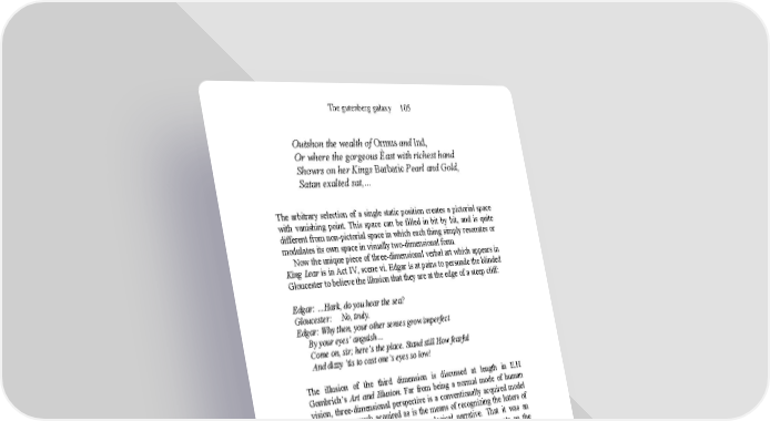 The gutenberg galaxy 105 Outshon the wealth of Ormus and Ind, Or where the gorgeous Èast with richest hand Showrs on her Kings Barbaric Pearl and Gold, Satan exalted sat,… The arbitrary selection of a single static position creates a pictorial space with vanishing point. This space can be filled in bit by bit, and is quite different from non-pictorial space in which each thing simply resonates or modulates its own space in visually two-dimensional form. Now the unique piece of three-dimensional verbal art which appears in King Lear is in Act IV, scene vi. Edgar is at pains to persuade the blinded Gloucester to believe the illusion that they are at the edge of a steep cliff: Edgar: …Hark, do you hear the sea? Gloucester: No, truly. Edgar: Why then, your other senses grow imperfect By your eyes’ anguish… Come on, sir; here’s the place. Stand still How fearful And dizzy ’tis to cast one’s eyes so low! The illusion of the third dimension is discussed at length in E.H Gombrich’s Art and Illusion. Far from being a normal mode of human vision, three-dimensional perspective is a conventionally acquired model of seeing, as much acquired as is the means of recognizing the letters of the alphabet, or of following chronological narrative. That it was an acquired illusion Shakespeare helps us to see by his comments on the other senses in relation to sight. Gloucester is ripe for illusion because he has suddenly lost his sight. His power of visualization is not quite separate from his other senses. And it is the sense of sight in deliberate isolation from the other senses that confers on man the illusion of the third dimension, as Shakespeare makes explicit here. There is also the need to fix the gaze: Come on, sir; here’s the place. Stand still. How fearful And dizzy ’tis to cast one’s eyes so low! The crows and choughs that wing the midway air Show scarce so gross as beetles. Halfway down Hangs one that gathers sampire—dreadful trade! Methinks he seems no bigger than his head. The fishermen that walk upon the beach, Appear like mice; and yond tall anchoring bark, Diminish’d to her cock; her cock, a buoy