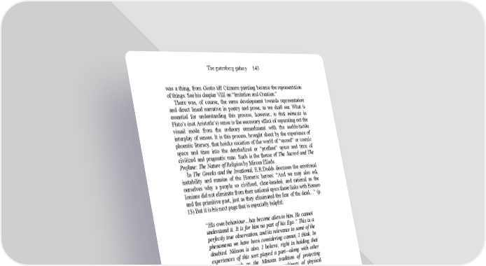 The gutenberg galaxy 143 was a thing, from Giotto till Cézanne painting became the representation of things. See his chapter VIII on “Imitation and Creation.” There was, of course, the same development towards representation and direct lineal narrative in poetry and prose, as we shall see. What is essential for understanding this process, however, is that mimesis in Plato’s (not Aristotle’s) sense is the necessary effect of separating out the visual mode from the ordinary enmeshment with the audile-tactile interplay of senses. It is this process, brought about by the experience of phoentic literacy, that hoicks societies of the world of “sacred” or cosmic space and time into the detribalized or “profane” space and time of civilized and pragmatic man. Such is the theme of The Sacred and The Profane: The Nature of Religion by Mircea Eliade. In The Greeks and the Irrational, E.R.Dodds discusses the emotional instability and manias of the Homeric heroes: “And we may also ask ourselves why a people so civilised, clear-headed, and rational as the Ionians did not eliminate from their national epics these links with Borneo and the primitive past, just as they eliminated the fear of the dead…” (p. 13) But it is his next page that is especially helpful: “His own behaviour…has become alien to him. He cannot understand it. It is for him no part of his Ego.” This is a perfectly true observation, and its relevance to some of the phenomena we have been considering cannot, I think, be doubted. Nilsson is also, I believe, right in holding that experiences of this sort played a part—along with other elements, such as the Minoan tradition of protecting goddesses—in building up that machinery of physical intervention to which Homer resorts so constantly and, to our thinking, often so superfluously. We find it superfluous because the divine machinery seems to us in many cases to do no more than duplicate a natural psychological causation. But ought we not perhaps to say rather that the divine machinery “duplicates” a psychic intervention— that is, presents it in a concrete pictorial form? This was not superfluous; for only in this way could it be made vivid to the imagination of the hearers. The Homeric poets were without the refinements of language which would have been needed to “put across” adequately a purely psychological miracle. What more natural than that they should first supplement, and later replace, an old unexciting threadbare formula like by making the god appear as a physical presence and exhort his favourite with the spoken word? How much more vivid than a mere inward monition is the famous scene in Iliad I where Athena plucks Achilles by the hair and warns him not to strike Agamemnon! But she is visible to Achilles