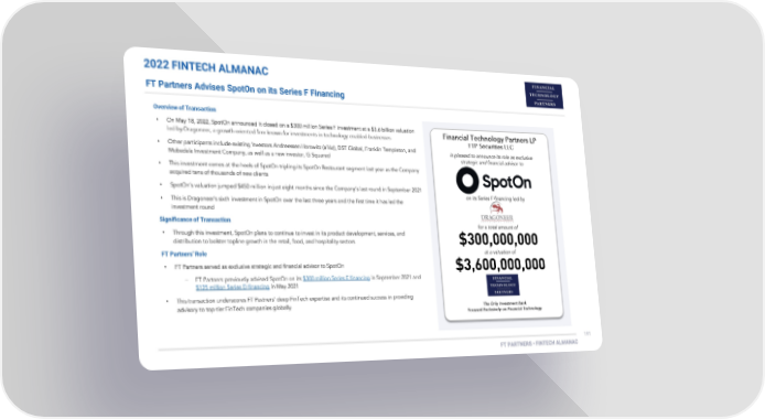 2022 FINTECH ALMANAC FT Partners Advises SpotOn on its Series F Financing Overview of Transaction • • • • • Significance of Transaction • FT Partners’ Role • •