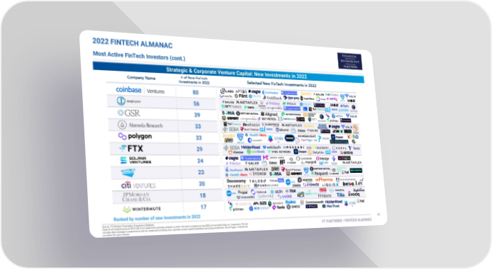 FT Partners 2022 FinTech Almanac Page 44 Page 462022 FINTECH ALMANAC Most Active FinTech Investors (cont.) Strategic & Corporate Venture Capital: New Investments in 2022 80 56 39 33 33 29 24 23 20 18 17 Ranked by number of new investments in 2022