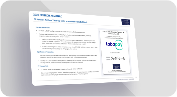 2022 FINTECH ALMANAC FT Partners Advises TabaPay on its Investment From SoftBank Overview of Transaction • • Significance of Transaction • • FT Partners’ Role • •