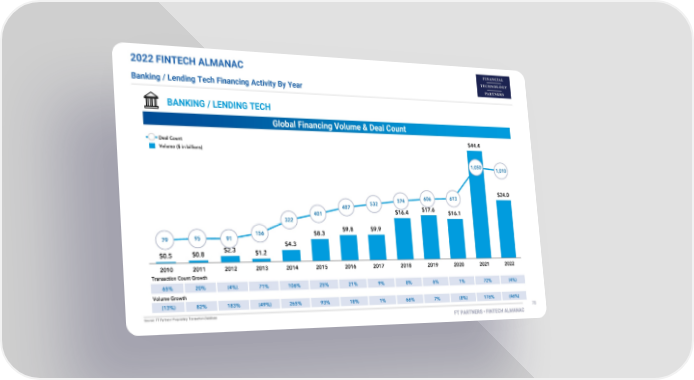2022 FINTECH ALMANAC Banking / Lending Tech Financing Activity By Year BANKING / LENDING TECH Global Financing Volume & Deal Count 1,200 1,000 800 600 400 200 - (200)