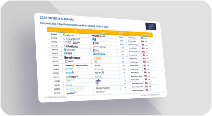 2022 FINTECH ALMANAC Selected Large / Significant Healthcare FinTech M&A Deals in 2022 Claims Editing Business Midas Health Analytics