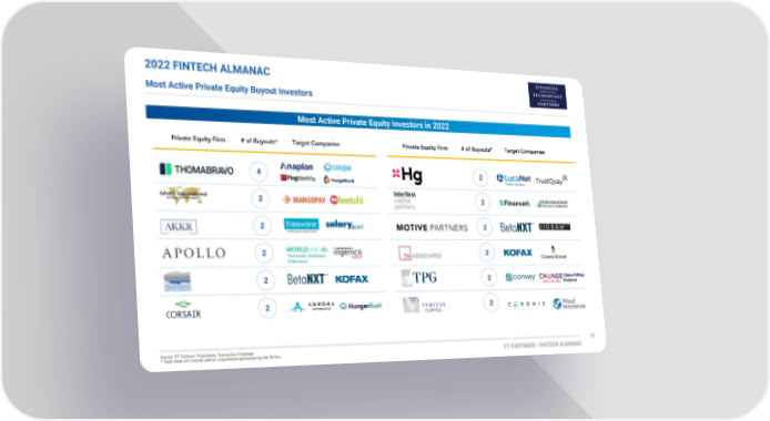 2022 FINTECH ALMANAC Most Active Private Equity Buyout Investors Most Active Private Equity Investors in 2022 Terminals, Solutions & Services Claims Editing Business