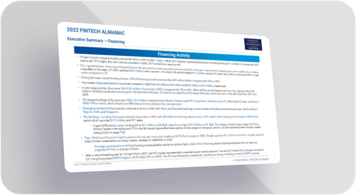 2022 FINTECH ALMANAC Executive Summary –Financing Financing Activity • • • • • • • • • •