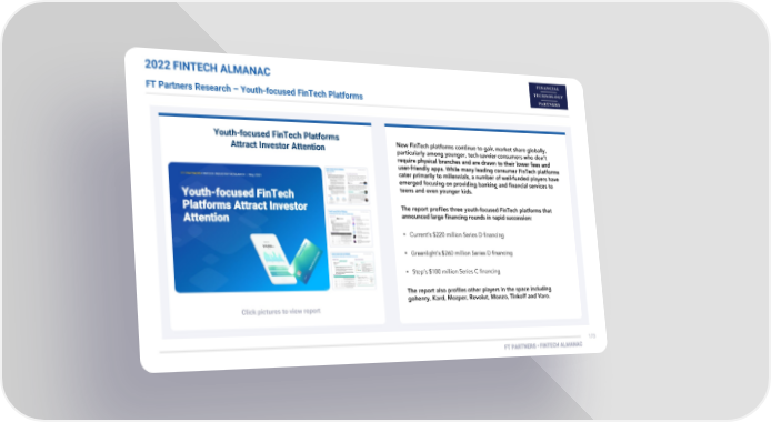 2022 FINTECH ALMANAC FT Partners Research – Youth-focused FinTech Platforms Youth-focused FinTech Platforms Attract Investor Attention • • • Click pictures to view report