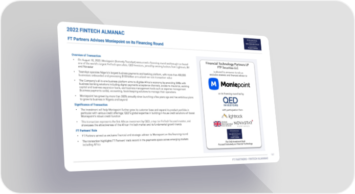 2022 FINTECH ALMANAC FT Partners Advises Moniepoint on its Financing Round Overview of Transaction • • • • Significance of Transaction • • FT Partners’ Role • •