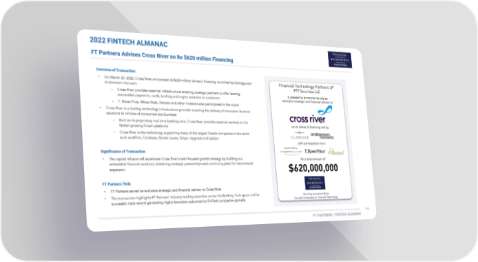 2022 FINTECH ALMANAC FT Partners Advises Cross River on its $620 million Financing Overview of Transaction • • Significance of Transaction • FT Partners’ Role • •
