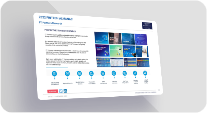 2022 FINTECH ALMANAC FT Partners Research PROPRIETARY FINTECH RESEARCH FT Partners regularly publishes detailed research highlighting key trends driving market activity across all sectors of FinTech. Our research and analysis has been featured on Bloomberg, The Wall Street Journal, Dow Jones and the Financial Times and is regularly viewed by CEOs and industry leaders. FT Partners' unique insight into FinTech is a direct result of successfully executing hundreds of transactions combined with over 20 years of exclusive focus on the FinTech sector. Each report published by FT Partners contains an in-depth review of a unique area of the FinTech marketplace and is highly valuable and topical to CEOs, board members, investors and key stakeholders across the FinTech landscape. Industry Deep Monthly Market Transaction Video Executive Real-Time Quarterly In-Depth Dive Reports Regional Reports Updates Case Studies Conferences Interviews Infographics & Annual Company Insights Profiles WWW.FTPARTNERS.COM