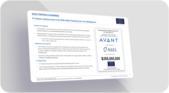 2022 FINTECH ALMANAC FT Partners Advises Avant on its $250 million Financing from Ares Management Overview of Transaction • • Significance of Transaction • • FT Partners’ Role • •