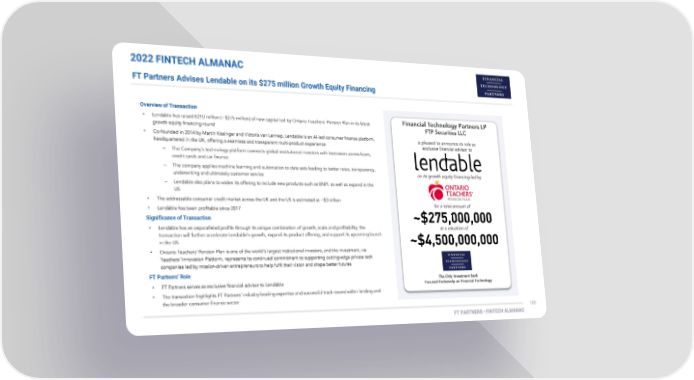 2022 FINTECH ALMANAC FT Partners Advises Lendable on its $275 million Growth Equity Financing Overview of Transaction • • • • Significance of Transaction • • FT Partners’ Role • •